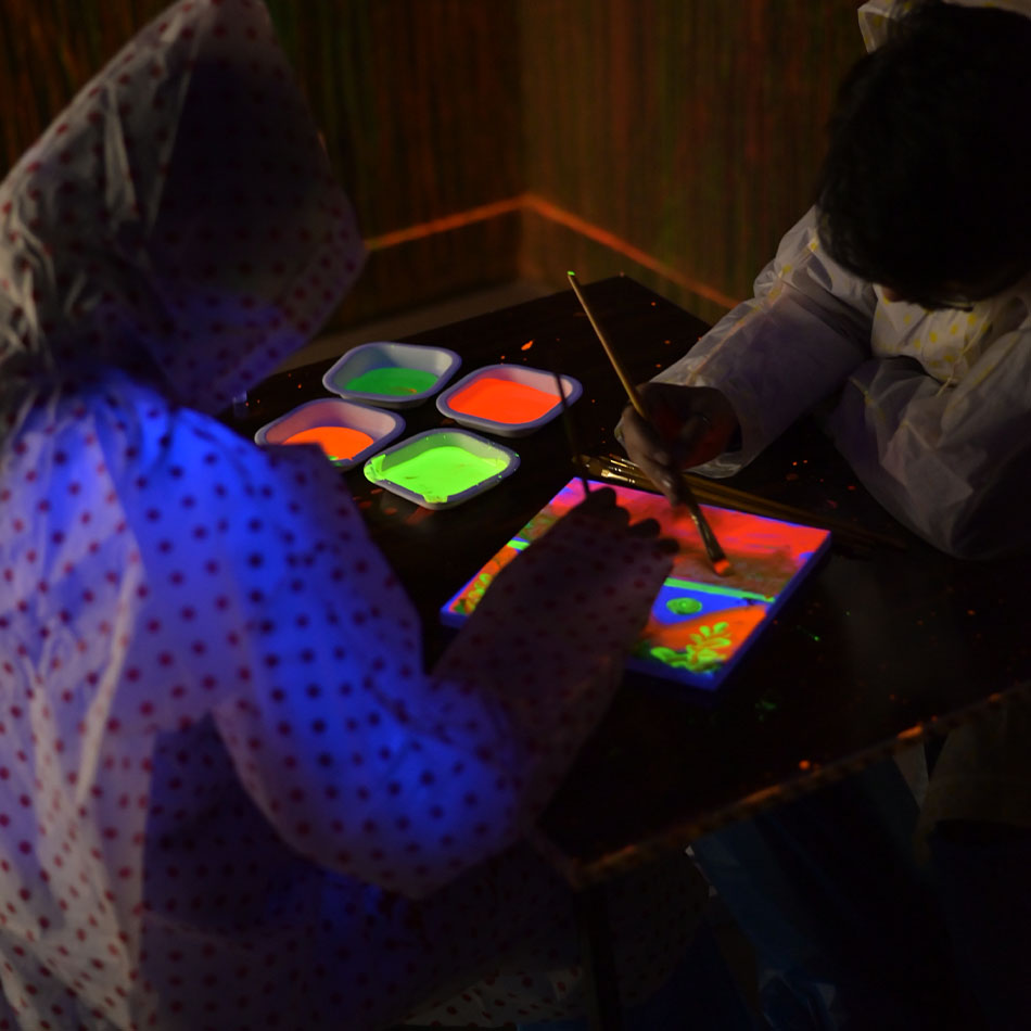 Paint your canvas with neon paints in the dark and reveal the masterpiece.